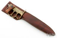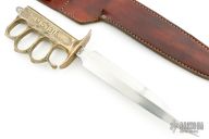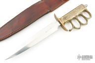 This Trench Knife has a double edged satin finished blade by EIG Cutlery Italy, .238" blade stock and 1.174" blade depth, hidden tang construction. The handle is an original AuLion brass knuckle handle that has been modified. Comes with a custom brown leather sheath. Has some patina, scratches, some light pitting on the blade, otherwise good condition for what it is. Pretty cool piece!