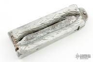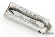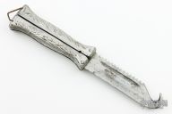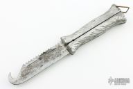 This Balisong features blade with sawteeth on the spine, fullers and a guthook. The handle is composed of two cast aluminum pieces. Scuffs, scratches and oxidation are visible on blade and handle. Fair condition for its age.