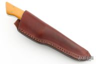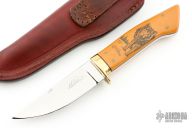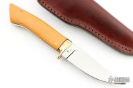This hunter by TJ Yancey features a mirror finished blade with .188" blade stock and 1.058" blade depth, full tang construction. The handle has a brass guard, yellow paper micarta scales with maroon liners, brass pins and scrimshaw on the handle, signed A. Yancey. Comes with a brown leather sheath. Has some light oxidation on the tang, and some light pitting on the blade, otherwise good condition. "C 51" on the blade.
