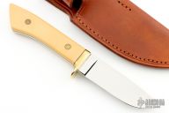 This Limited Edition Hunter by TJ Yancey features a mirror finished blade with .176" blade stock and .986" blade depth, full tapered tang construction. The handle has a brass guard, yellow paper micarta scales with black liners, brass pins and scrimshaw on the handle, signed A. Yancey and #22/25. Comes with a brown leather sheath. Excellent condition.