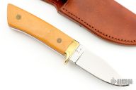 This hunter by TJ Yancey features a satin finished blade with notched thumbrest, .206" blade stock and 1.010" blade depth, full tang construction. The handle has a brass guard, yellow paper micarta scales with maroon liners, brass pins. Comes with a brown leather sheath. Excellent condition.  "U 51" on the blade.