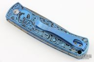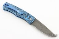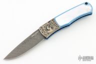 This Magic Bolster Release Automatic from Pro-Tech Knives features a drop point Damascus blade with swedge. The handle has a titanium frame with a mother-of-pearl inlay and art deco engraving.  The handle has a milled and anodized tip up titanium pocket clip.  Includes the original box and display case.  Excellent Condition.