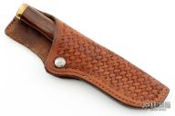 This hunter by TJ Yancey features a mirror finished blade with .184" blade stock and 1.221" blade depth, hidden tang construction. The handle has a brass guard and butt, dymondwood grip. Comes with a hand tooled brown leather sheath. Excellent condition.