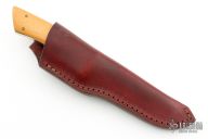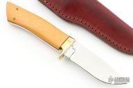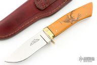 This hunter by TJ Yancey features a mirror finished blade with .199" blade stock and 1.117" blade depth, full tang construction. The handle has a brass guard, yellow paper micarta scales with maroon liners, brass pins and scrimshaw on the handle, signed A. Yancey. Comes with a brown leather sheath. Excellent condition. "D 051" on the blade.