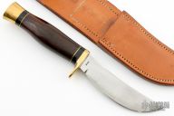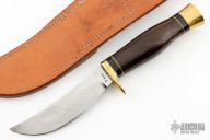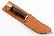 This Model T by Ralph Bone features a satin finished blade with notched thumbrest, .187" blade stock and 1.046" blade depth, hidden tang construction. The handle is comprised of brass guard and butt, black and brass spacers, cocobolo grip. #T 616 on the blade. Has some scratches, has been resharpened, otherwise good condition. Comes with a brown leather sheath with "T" on the back.
