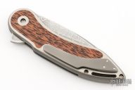 This One of a Kind Glimpse linerlock flipper by Todd Begg features a Damascus blade with flipper. The handle has a two tone titanium frame with palmwood inlays, lanyard hole and tip up titanium clip. Nice detent, lockup and blade seating. Excellent condition. Comes with a zippered case.