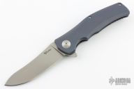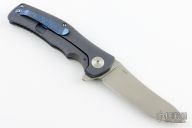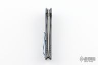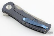 This Hills flipper from Reate features a stonewashed blade with notched thumbrest and flipper. The handle has a milled and anodized titanium frame with a bead blasted tip up clip. Nice detent, lockup and blade seating. Excellent condition.