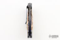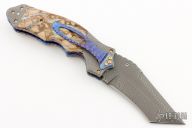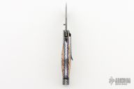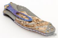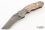 This Triumph by Crawford Knives features a Damascus blade with false top edge, fileworked thumbrest and a diamond inlaid thumbstud. The handle has dovetailed Damascus bolsters front and rear , and mammoth tooth scales with red liners, anodized and fileworked titanium liners with jeweled interiors, fileworked, jeweled and anodized tip down titanium clip, fileworked stainless steel backspacer, gold plated screws. The handle has 9 diamonds inlaid in the bolsters. Smooth action. Nice detent, lockup and blade seating. Great looking materials. Excellent condition. Comes with a zippered case.
