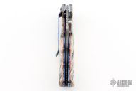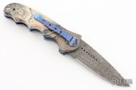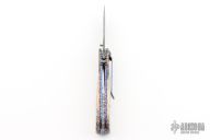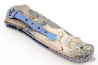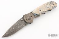 This Express from Crawford Knives features a Damascus blade with false top edge and a thumbstud with Diamond inset. The handle has super conductor dovetailed bolsters, mammoth tooth scales with red liners, anodized and fileworked titanium liners with jeweled interiors, Damascus fileworked backspacer 7 diamonds set in gold bezels, tip down titanium clip that is anodized, jeweled and fileworked. Nice detent, lockup and blade seating. Comes with a zippered case. Excellent condition.