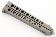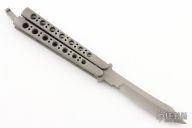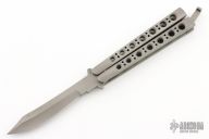 This early Scimitar Balisong features a Jody Samson ground "Military" finished blade. The handles are "Military" finished stainless steel. Has some light scuffs and scratches, otherwise good condition. Comes with original box and sheath.
