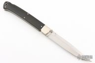 This Outlaw lockback by Phil Boguszewski features a hand rub finished blade with false top edge and dual checkered thumbstuds. The handle has nickel silver bolsters and liners, black linen micarta scales with nickel silver pins and lanyard hole, stainless steel backspacer. Has some light scratches, otherwise excellent condition.
