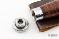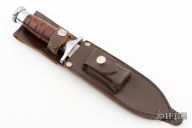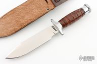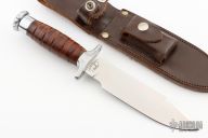 This Survival Knife by Garcia features a mirror finished spear point blade with sawteeth on the spine, .139" blade stock and 1.469" blade depth, hidden tang construction. The handle has an aluminum guard, stacked leather hollow handle and removable aluminum butt cap, has storage area in handle. Has a brown leather sheath. Has some light scratches, excellent condition otherwise. Comes with original box and papers.