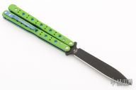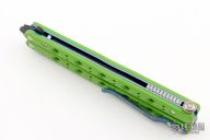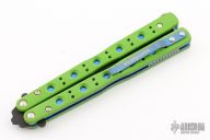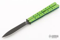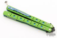 This Morpho 51 Balisong from Benchmade has a black spear point D2 stainless steel blade. Handle is green G-10 with blue anodized titanium liners and milled stainless steel spacers. Blue anodized titanium tip up clip and next-gen kicker pin. Comes with original box and paperwork. Excellent condition.