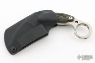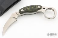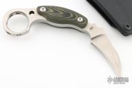 This Karambit by Kazutoshi Tanabe features a satin finished blade with notched thumbrest, .310" blade stock and .877" blade depth, full tang construction. The handle has black/green G-10 fiber scales. Comes with kydex sheath. Excellent condition.