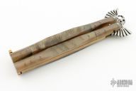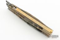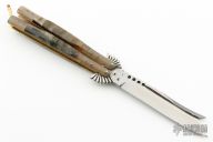 This Balisong features a satin finished blade with fullers and fileworked spine. The handle has honey horn bolsters, sheephorn scales, brass chanell construction and a brass t-latch. Has some scratches and patina, otherwise good condition.  "Mauro" is stamped on the T-Latch