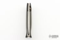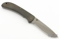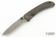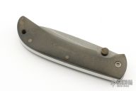 This knife by Barry Dawson features a bead blast finished blade with a checkered thumbstud. The handle has black linen micarta scales, stainless steel liner, stainless steel backspacer. Has scuffs and scratches, otherwise good condition. #17