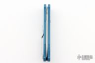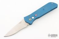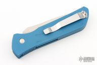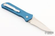 This Python side-opening automatic from Dynamic Knife Designs has a satin finish plain edge blade and a blue aluminum handle. Coil spring. Stainless steel clip. Sliding safety. Excellent condition. Comes with original box and papers.