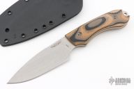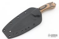 This Guardian 4 by Bradford Knives features a stonewashed blade with notched thumbrest, .165" blade stock and 1.451" blade depth. The handle is layered wood/g-10 scales over full tang construction. Exposed tang pommel with lanyard hole. Includes kydex sheath. Excellent condition.