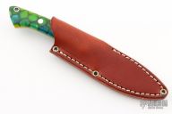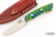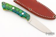 This Fox River Featherweight by Bark River Knives features a satin finished blade with .099" blade stock and .878" blade depth, full tang construction. The handle has Borealis Dragon scales with yellows liners. Comes with a brown leather sheath and original box and papers. Excellent condition.