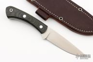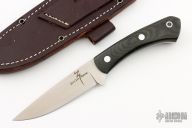 The Krestel by Zoe Crist Knives has a satin finish blade, .123" black stock and .955" blade depth, full tang construction. The handle has black canvas micarta scales with lanyard hole. Comes with a brown leather sheath and COA. Excellent condition.