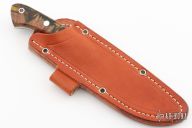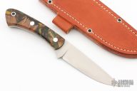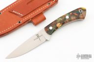 The Krestel by Zoe Crist Knives has a satin finish blade, .126" black stock and .961" blade depth, full tang construction. The handle has Hybrid Natural Maple Burl and Multicolor Resin scales with lanyard hole. Comes with a brown leather sheath, original box and COA. Excellent condition.