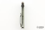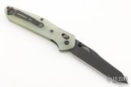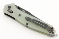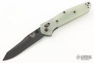 This 940BK Osborne Axis Lock Folder from Benchmade has a black coated clip point blade with false top edge and dual thumbstuds. Handle is jade G10 with a black finished stainless steel tip up clip (RH/LH Reversible). Nice blade seating and lockup. Comes with original box, papers, and drawstring pouch. Excellent condition.