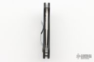 Handle: Peel ply textured, chamfered black G10 scales house inset skeletonized stainless liners, one forming the Compression Lock mechanism. A generous palm swell, index groove and pinky hook offer comfortable ergonomics and a secure grip for most users.