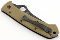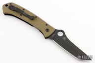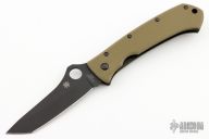 This Bob Lum designed folding knife by Spyderco features a black tanto style blade marked with the Lum Logo. Stainless steel liners. Textured green G-10 scales, tip up stainless steel clip. Comes with original box and papers. Nice detent, lockup and blade seating. Excellent condition.