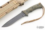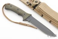 This Neil Roberts - BUD/S Class 184 - Warrior Knife has a matte black S30V stainless steel drop point blade with full tang and notched thumbrest.  .225" Blade Stock.  1.334"Blade Depth. Handle is canvas micarta with lanyard. Knife is in excellent condition. Comes with original box, COA (dated October 6, 2006) and nylon sheath.  Excellent condition.