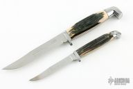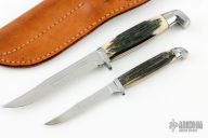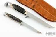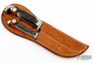 This set of knives by Queen Cutlery Company features Queen Steel polished blades, aluminum guards and butts, synthetic jigged bone scales. Comes with a tooled brown leather sheath that holds both knives.