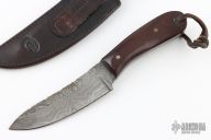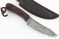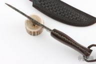 This knife by CJ Deubel features a Damascus blade with fileworked spine, .177" blade stock and 1.301" blade depth, full tang construction. The handle has snakewood scales with mosaic pins and a fileworked tang. Comes with a hand tooled black leather sheath. Has some light oxidation, otherwise good condition.
