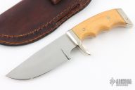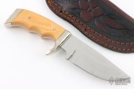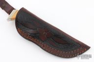 This knife features a satin polished blade with .181" blade stock and 1.427" blade depth, full tang construction. The handle has a nickel silver guard and butt with antique red line Westinghouse micarta scales. Comes with a hand tooled brown leather sheath. Has some light scratches, otherwise excellent condition.