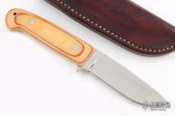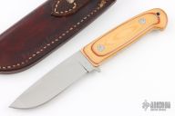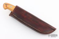 This knife by Roy Blaum features a mirror polished blade with .188" blade stock and 1.149" blade depth, full tang construction. The handle has antique red line Westinghouse micarta scales. Coems with a brown leather sheath dated '80. Has a few light scratches, otherwise excellent condition.