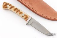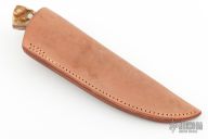This Hunter by Tommy Lee features a hand rub satin finished blade with checkered thumbrest, .158" blade stock and .898" blade depth, full tapered tang construction. The handle has nickel silver guard, rams horn scales with red liners. Comes with a brown leather sheath. Has some light scratches, otherwise good condition.