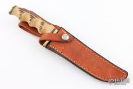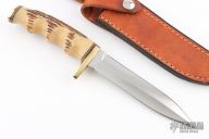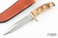 This dagger by Jim Berry features a double edged satin finished blade with .175" blade stock and 1.004" blade depth, hidden tang construction. The handle has a brass guard and butt with finger groove stag grip, black/white/red spacers. Comes with a brown leather sheath, but I don't think it is original. Has some light scratches and a few light spots on the blade, otherwise good condition.