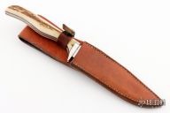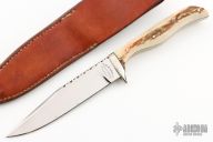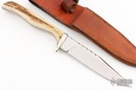 This knife by AM Maddux features a satin finished blade with fileworked spine, sharpened top edge, .177" blade stock and .967" blade depth, full tang construction. The handle has a nickel silver guard with stag scales,. Comes with brown leather sheath. Has a couple of small spots on the blade, otherwise excellent condition.