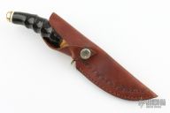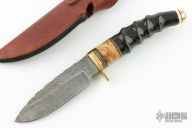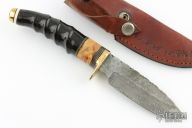 This knife features a Damascus blade with fileworked spine, .170" blade stock and 1.209" blade depth, hidden tang construction. The handle has a brass guard and butt, kudu horn grip with black/brass/wood spacers. Comes with a brown leather sheath. Has some light patina, otherwise excellent condition.