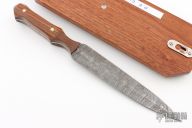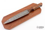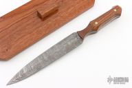 This Dagger by DV Customs features a double-edged 385 layer Damascus blade with full tang construction, .134" Blade Stock, 1.256" Blade Depth.  The handle has Bolivian Rosewood scales with mosaic pins.  Includes an Ash stand with a magnet to hold the knife in place.  S/N 208.  New from maker. Comes with COA.