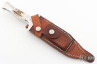 This 29A Junior Bowie by Ruana Knives features a satin finished blade with a sharpened top edge, .220" blade stock and 1.216" blade depth, hidden tang construction. The handle is cast from aluminum with elk inserts. Comes with brown leather sheath. Excellent Condition.