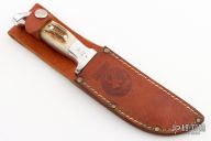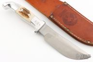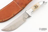 This Model 14B Skinner by Rudy Ruana features a satin finished blade with false top edge, .177" blade stock and 1.389" blade depth, hidden tang construction. The handle is cast from aluminum with elk inserts, guard has "M" stamp which signifies it was made by Rudy Ruana. Comes with brown leather sheath. Has some light scratches, otherwise excellent condition.