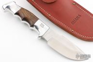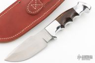 This 28CD skinner by Ruana has a satin finished blade with notched thumbrest and a choil, .188" blade stock and 1.525" blade depth, hidden tang construction. The handle has a cast aluminum handle with ironwood inserts. Comes with leather sheath. Excellent Condition.