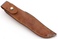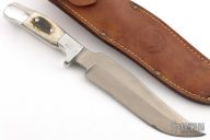 This Custom Finn made by Rudy Ruana features a satin finished recurve blade with false top edge and notched thumbrest, .174" blade stock and 1.487" blade depth, hidden tang construction. The handle is cast aluminum with elk inlays. Comes with brown leather sheath. Has a couple light scratches, otherwise excellent condition.
