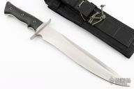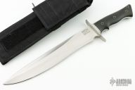 This Model 2 by Walter Brend features a double hollow ground blade with a hand rub satin finish finish and sharpened top edge, .264" blade stock and 1.887" blade depth, full tang construction. The handle has a satin finished titanium double guard, and black canvas micarta scales, hollow tube pins and lanyard hole. Comes with a black nylon sheath with kydex insert. This knife is beautiful and sports the "Walterboro SC" logo. Excellent condition. Comes with a zippered case.