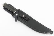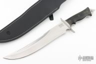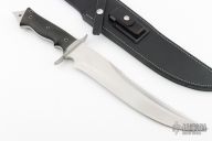 This Model 5 by Walter Brend features a double hollow ground blade with a hand rub satin finish and sawteeth/serrations on the spine, .287" blade thickness and 2.193" blade depth, full tang construction. The handle has a satin finished titanium guard, black linen micarta scales with stainless steel pins. Beautiful work. Includes a black leather sheath and a zippered case. Excellent condition.