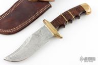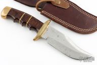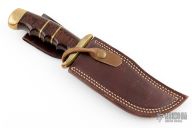 This Bowie by John Nelson Cooper features a satin finished blade with a sharpened top edge, .249" blade stock and 1.688" blade depth, hidden tang construction. The handle has brass guard and butt, burlap micarta grip with brass spacers. Has some patina/oxidation/scratches, otherwise good user condition. Comes with brown leather sheath and a zippered case.