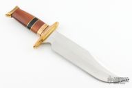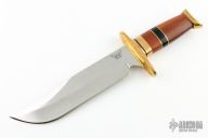 This bowie by John Nelson Cooper features a satin finished clip point blade with false top edge, .230" blade stock and 2.226" blade depth, hidden tang construction. The handle has a brass guard, butt and spacers with natural linen micarta grip. Comes with a zippered case. Has some light scratches, otherwise excellent condition.