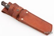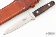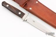This Loveless Style Dagger by Bob Dozier features a hand ground mirror polished blade with false top edge, .170" blade stock and .843" blade depth, full tapered tang construction. This knife was hand ground and made solely by Bob Dozier. The handle has a stainless steel guard, desert ironwood scales. Has lanyard hole at the butt. Comes with a brown leather sheath and original paper wrapping. Excellent condition.