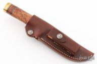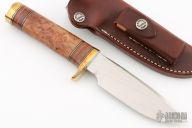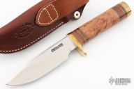 The Model 25-5 by Randall Made Knives is a drop point hunter similar to Model 11, but handle construction is reminiscent of 1930′s design. Excellent skinning, outdoors knife. This knife has a carbon steel blade with notched thumbrest, .208" blade stock and 1.315" blade depth, hidden tang construction. The handle brass guard and pommel, thuya burl wood grip with stacked leather, black and brass spacers. Comes with brown leather sheath and original paper wrapping. Excellent condition.