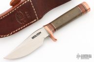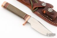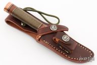 The miniature Model 27 debuted in Randall's 2012 75th anniversary catalog and is the first catalog miniature model. This knife has a 3.5" stainless steel blade, .157" blade stock and 1.056" blade depth, hidden tang construction. The handle has a copper guard and butt, green micarta grip, and black/copper/leather spacer pattern. Comes with a brown leather sheath and original paper wrapping. Excellent condition.