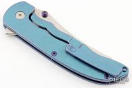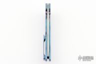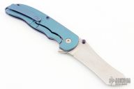 This Norseman (#7126) by John Grimsmo features a stonewashed blade with a single anodized titanium thumb stud, notched thumb ramp and flipper. Stonewash and anodized finished titanium frame with anodized titanium screws. Has a matching clip with hidden screws. Very smooth action that requires no wrist movement. Nice detent, lockup and blade seating. Rides on ceramic bearings. Comes with original packaging, custom hard case, Nano-Oil, tool, and COA dated Sept 24, 2019. Has a light scratch on the frame, otherwise excellent condition.
